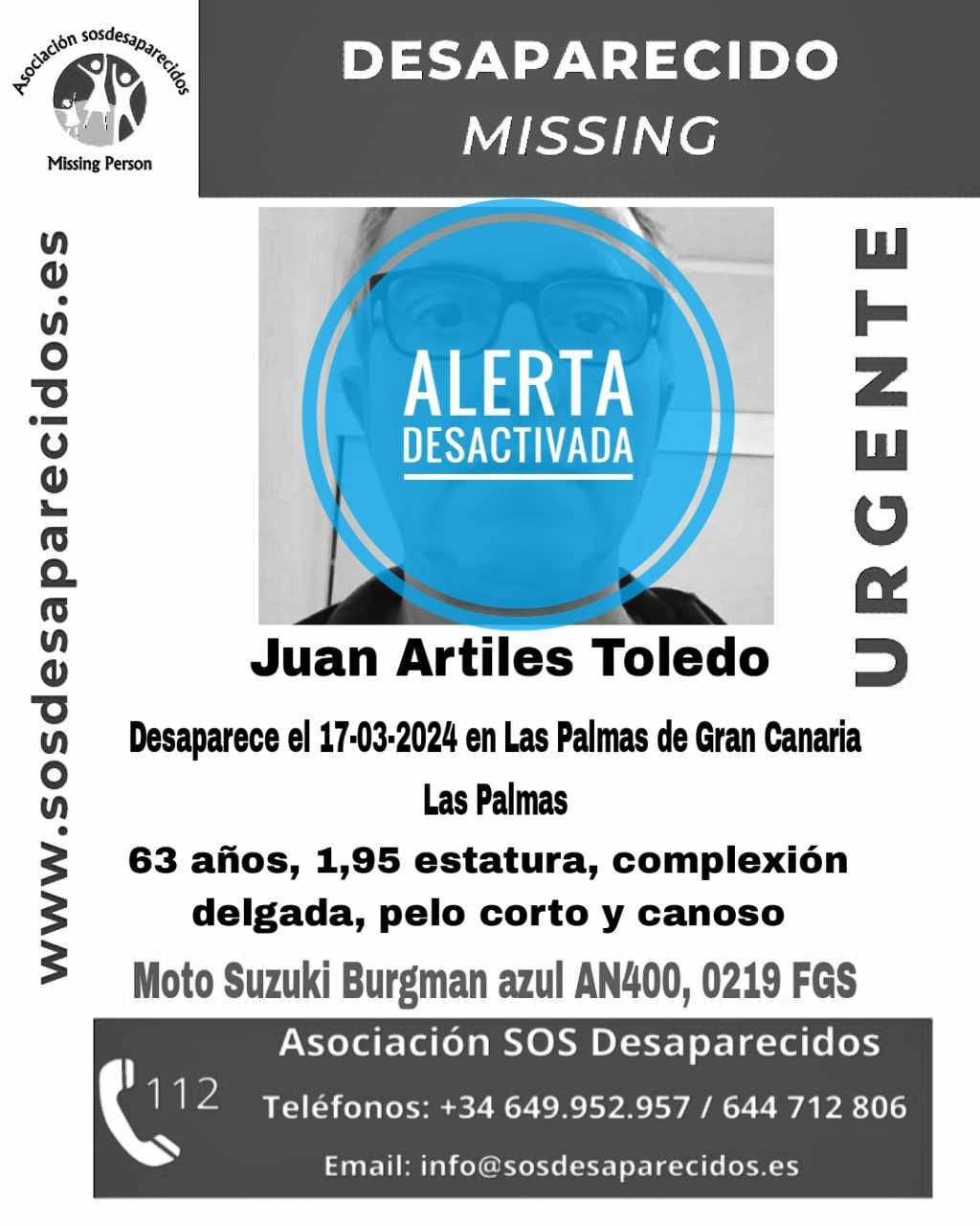 Tras la desaparición anunciada ayer domingo, 17 de marzo, de Juan Artiles Toledo en Las Palmas de Gran Canaria, la Asociación SOS Desaparecidos emitió una alerta. Sin embargo, hoy lunes se ha informado que su búsqueda ha sido desactivada tras su localización, según ha confirmado la misma asociación.