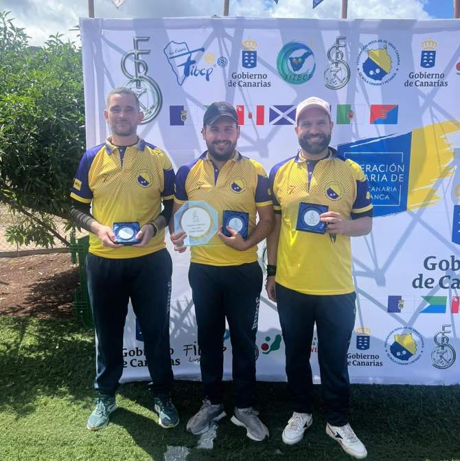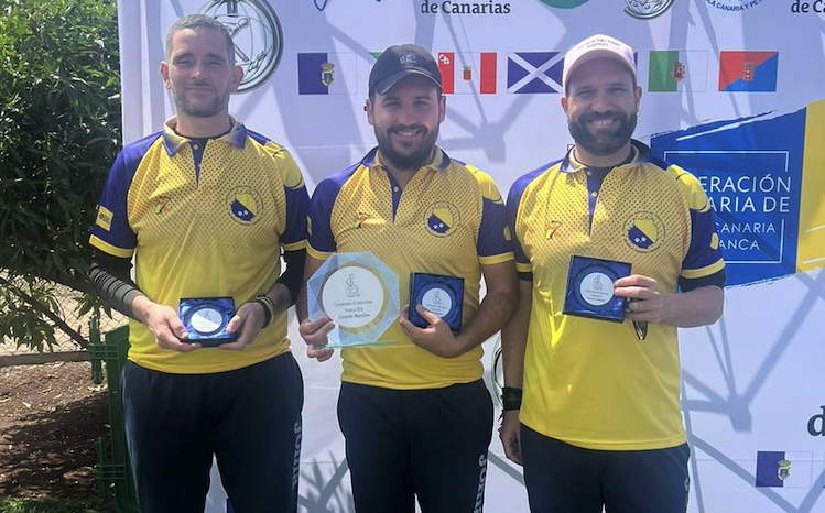 Los jugadores del CBP Harimaguada Juan Jesús Martel, Carlos Ceballos y Zebenzui Barreto lograron junto a los jugadores del Vive Moya Joaquín y Samuel Guerra el título para la selección de Gran Canaria en el Campeonato Autonómico de Selecciones Insulares de Petanca 2024.