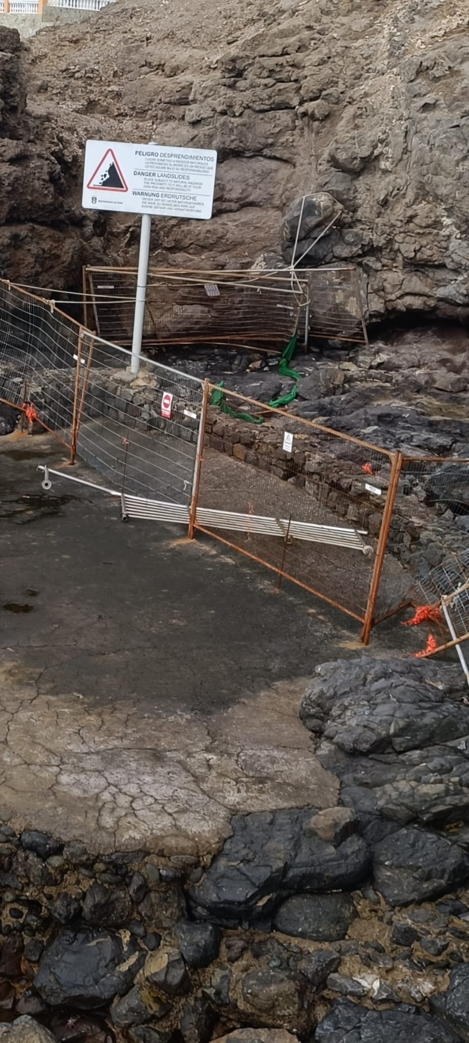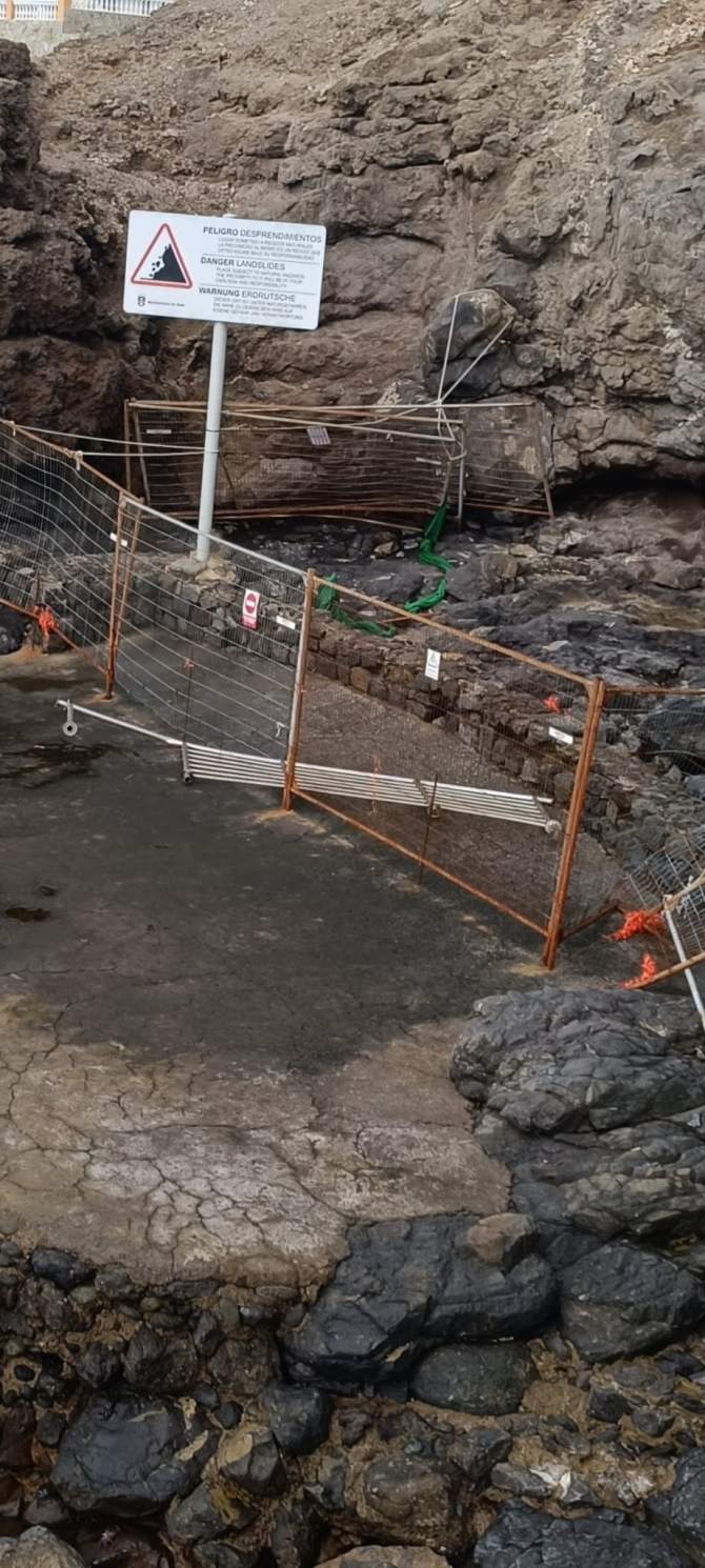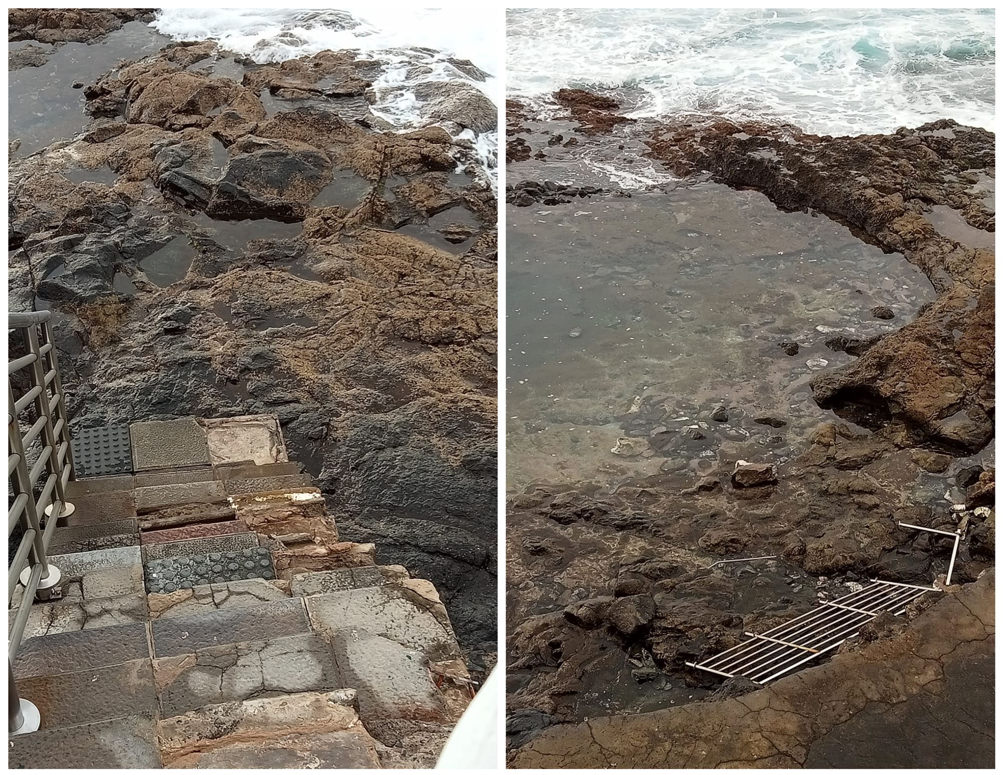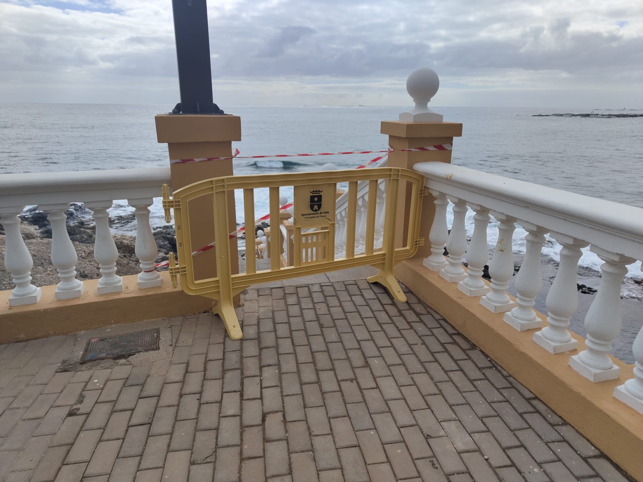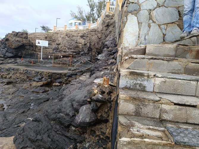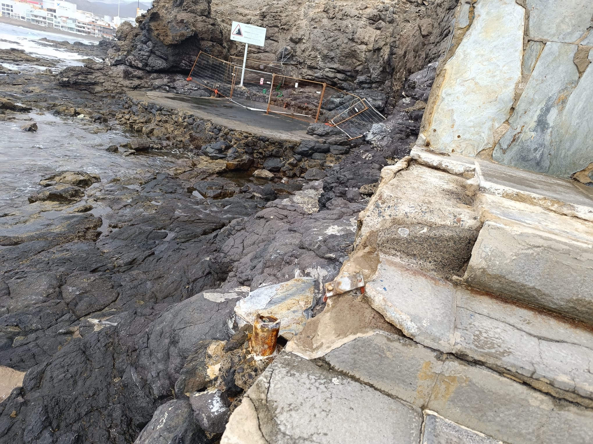 La Concejalía de Playas ha tomado la decisión de cerrar el acceso desde la avenida marítima al sector de riscos cercano a la Charca de los Pérez, en la costa de Clavellinas, debido a los daños causados por el fuerte oleaje. Tal y como informó esta mañana TELDEACTUALIDAD, el muro de la escalinata que sostenía una barandilla metálica de acero inoxidable se rompió, lo que provocó que la estructura se desprendiera y quedara tirada sobre las rocas.