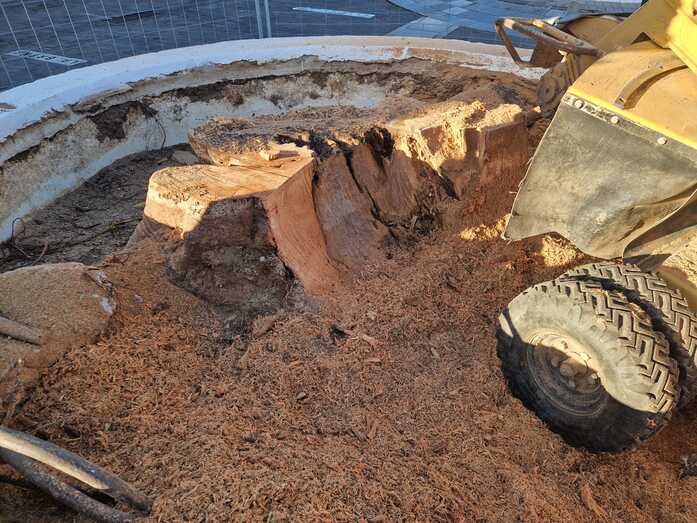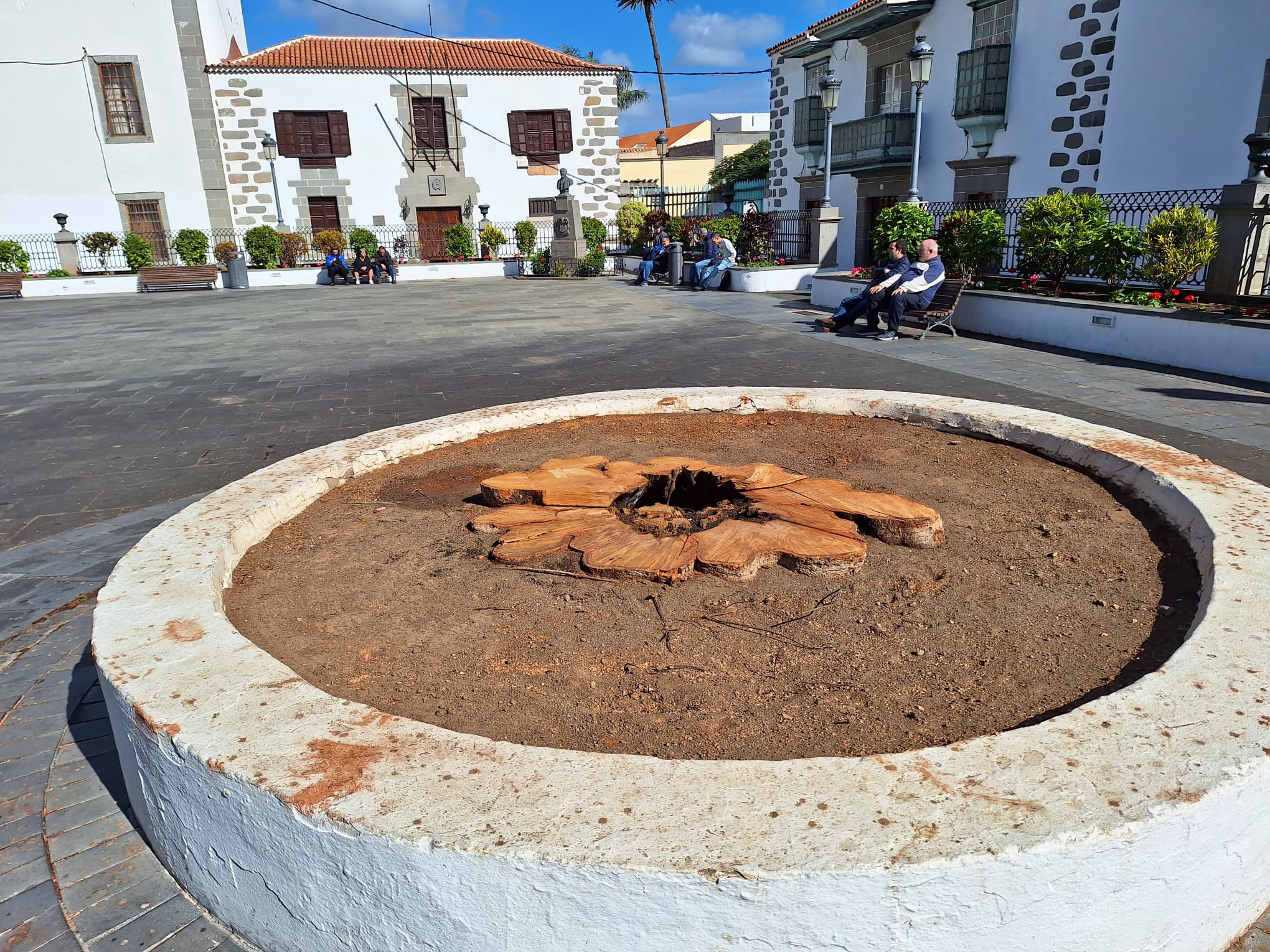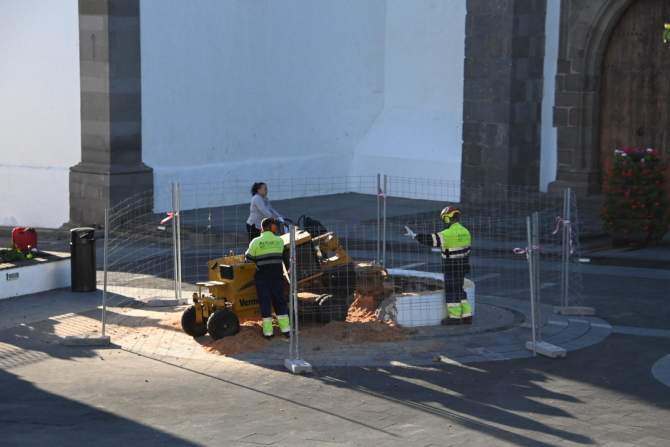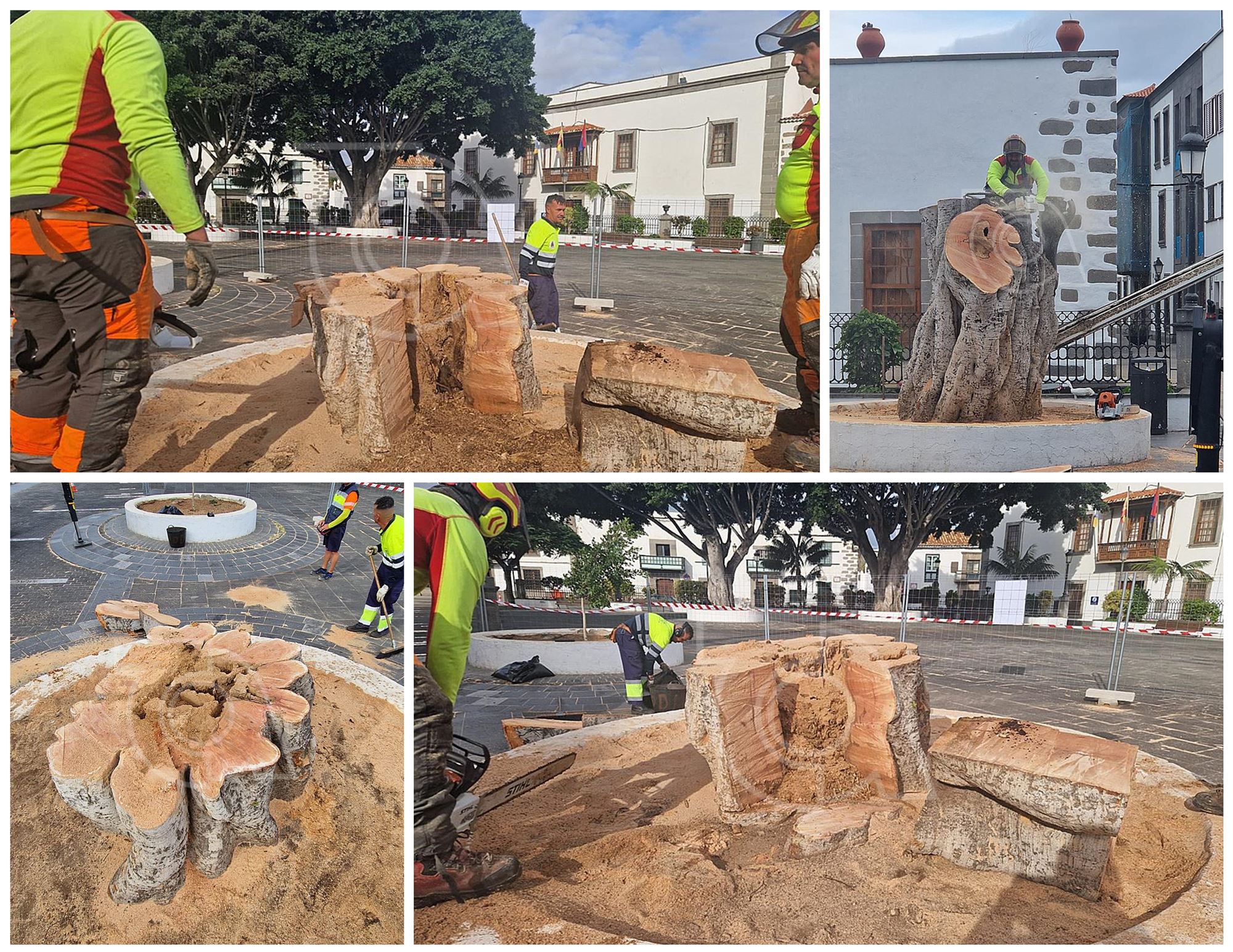 La Concejalía de Parques y Jardines, que coordina Juan Francisco Artiles, ha comenzado en la mañana de este martes a retirar el tronco del viejo laurel de Indias de la plaza de San Juan que fue talado a principios de marzo como medida preventiva ante el riesgo de desplome, como ya sucedió con otro de los ejemplares el pasado año.
