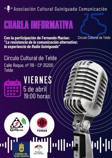 La sede del Círculo Cultural de Telde acoge este viernes la charla informativa ‘La resistencia de la comunicación alternativa: la experiencia de Radio Guiniguada’, que contará con la participación de Fernando Macías, secretario de Radio Guiniguada.