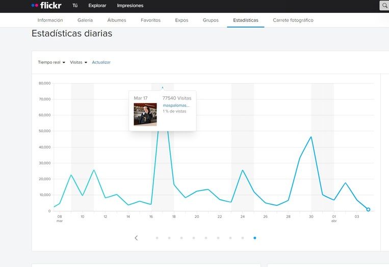 La popularidad de la plataforma de fotografía en línea Flickr ha vuelto a confirmarse con el impresionante número de visitas que la galería fotográfica de TELDEACTUALIDAD ha recibido el pasado mes de marzo. Con un total de casi 400.000 visitas, el sitio web ha experimentado un notable aumento en su volumen de acceso, mostrando el continuo interés del público por su contenido visual.