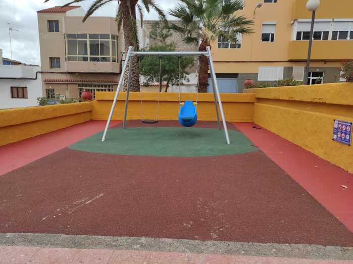 Vecinos de Ojos de Garza piden a la Concejalía de Parques y Jardines del Ayuntamiento de Telde alguna actuación para evitar que los remos del parque infantil amanezcan cada día llenos de excrementos de paloma, que impide que los niños los puedan utilizar para jugar.