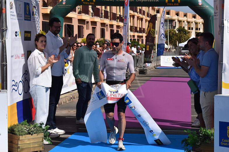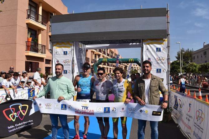 Ricardo Hernández Marrero, del club Triator llegado de la isla de Tenerife, se hizo con la cinta de meta con un tiempo de infarto de menos de una hora, completando el circuito de una forma frenética con 57 minutos y 23 segundos (57’23”) y liderando de principio a fin. Sacando una ventaja de casi un minuto en la natación, Hernández se puso en cabeza en una prueba en la que se ha sacado una deuda pendiente. No tuvo respiro en la casi una hora de reto deportivo, seguido de cerca por rivales potentes muy cerca en todo el recorrido. El triatleta belga Laurens Verluyten, del club Tenerife Réactivité Talasoterapia, no le quitó la vista de encima, cerrando apenas unos segundos después con 57 minutos y 38 segundos (57’38”). Samir Riseg Estévez ha sido el tercero en meta, cerrando el podio de campeones con un tiempo de 58 minutos y 6 segundos (58’06”).