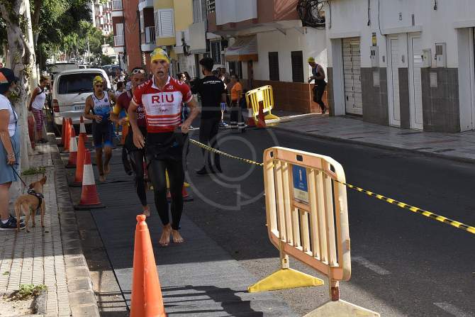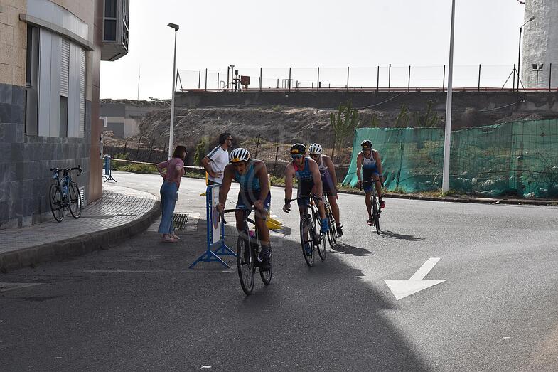 Después de la natación, los triatletas se enfrentaron a 20 kilómetros de ciclismo, partiendo de la calle Américo Vespucio y culminando con una carrera a pie de 5 kilómetros a lo largo del vial costero GC-117. El buen clima, con una temperatura ambiente de 24 grados y un día soleado, fue el aliado perfecto para los competidores en esta exigente jornada.
