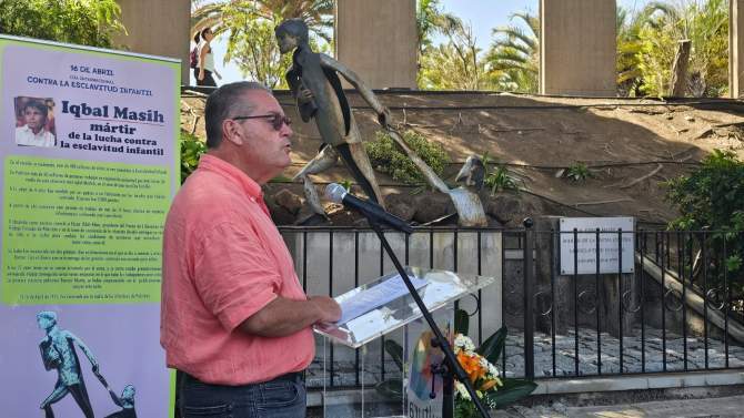 La escultura en honor al pequeño Iqbal Mashib, que preside la zona de juegos infantiles del parque de San Juan, sirvió en la mañana de este martes como escenario de la conmemoración del Día Internacional por la Erradicación de la Esclavitud Infantil, en el que el Ayuntamiento de Telde expuso su “total rechazo” al uso de niños y niñas en trabajos forzados en cualquier parte del mundo.