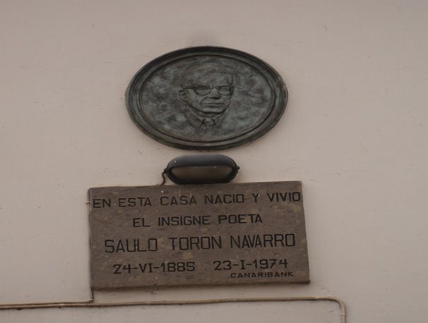 En la misma calle reseñada, pero en el número 34, se puso el relieve en homenaje a Saulo Torón Navarro, que sin duda, ha sido el poeta teldense de mayor proyección, pues formó parte de la gran tríada modernista junto a Tomás Morales y Alonso Quesada. Saulo publicó, gracias al empuje de sus amigos, las siguientes obras en el siguiente orden cronológico: Las monedas de cobre , El caracol encantado, Canciones en la orilla, Frente al Muro, resurrección y otros poemas y ya, de forma póstuma, le publicaron sus Poesías satíricas. Entre sus obras teatrales destacamos: La última de Frascorrita, La familia de Don Pancho,su tertulia y el inglés, y Duelo y jolgorio (4). El autor del relieve escultórico de Saulo lo realizó la artista madrileña Eva Montoro Pericás.