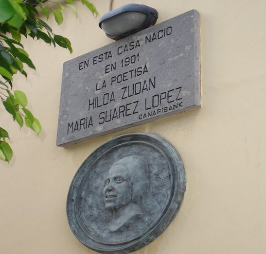 En la actual calle Pérez Galdós número 18 nos encontramos con otro medallón de bronce en relieve en homenaje a Hilda Zudán. La realidad es que ella no vivió en la referida ubicación, pues ella nació en la calle Cruz de Ayala del barrio de San Gregorio en 1901. No obstante, debemos indicar que allí su hermana María del Pino Suárez López tuvo su farmacia y de ahí se creó la confusión. Debemos señalar que Hilda Zudán era el pseudónimo de su verdadero nombre Mireya Suárez López. Su obra lírica, no tanto poética, también ha sido recopilada por nuestro ya mencionado en varias ocasiones Cronista Oficial de esta Ciudad (7). El medallón que recuerda a Hilda Zudán lo realizó la artista madrileña Eva Montoro Pericás.