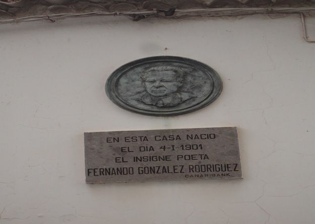 En la calle Comandante Franco número 4, se halla nuestro próximo poeta homenajeado y así, a través de un relieve escultórico, obra de Luis Arencibia Betancor, siguiendo la misma línea de ejecución que los anteriores, observamos un relieve de aproximadaamente 65 centímetros de diámetro realizado en bronce. En este caso, está dedicado a Fernando González Rodríguez, que a diferencia de Saulo, que no salió mucho de su “cuna sobre el Atlántico”( Gran Canaria) , nuestro poeta se desplazó con frecuencia, a raiz de la obtención de su Cátedra de Literatura en 1930 y luego, como consecuencia de su militancia política una vez acabada la Guerra Civil, momento que aprovechó para también licenciarse en Derecho y llegar a ejercer. Su producción poética fue publicada cronológicamente bajo los siguientes títulos: Canciones del alba(1918), Manantiales en la ruta(1923), El reloj sin horas (1929), Piedras Blancas ( 1934) y Ofrendas a la nada en 1949.(6)