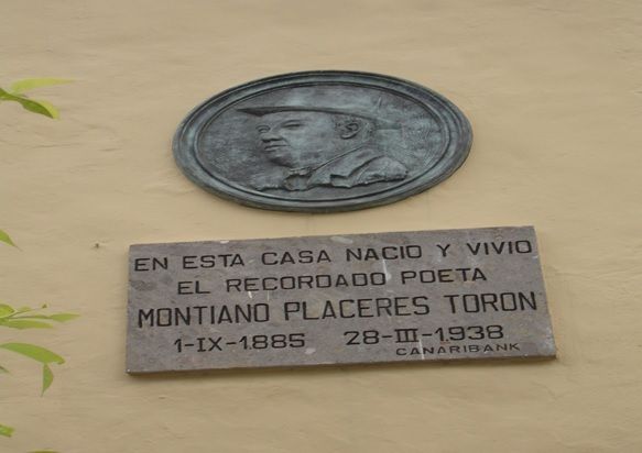 En la calle León y Castillo número 45 tenemos el tondo dedicado a Montiano Placeres Torón, cuya obra lírica ha sido rescatada por nuestro Cronista Oficial D. Antonio María González Padrón (2). Montiano publicó un solo libro de versos, El remanso de la horas en 1935. Recordemos que ha sido reeditado por el Cabildo Insular de Gran Canaria en este año 2024. Él fue el primer escritor nacido en Telde que se aventura con el género del teatro y publica en 1905 La Muñeca y además fue un gran animador del teatro teldense. También como autor teatral escribió La Siembra (3).El relieve escultórico de ese poeta lo realizó el artista Luis Arencibia Betancor.