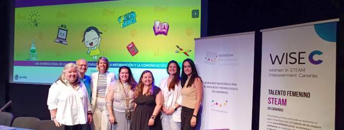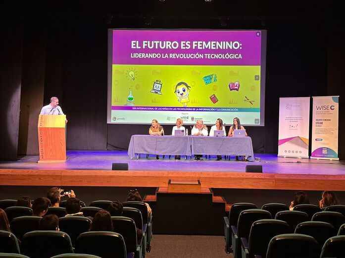 Romina Ojeda, presidenta de WISE Canarias, comentó la importancia de las asociaciones de mujeres para mejorar la visibilidad y el incremento de profesionales femeninas en el ámbito TIC. Mónica Santana, Esther P. Verdú y Sabina Hernández completaron la jornada con diferentes presentaciones sobre tecnologías emergentes y mujeres relevantes en este ámbito. El cierre de la jornada lo protagonizaron los jóvenes teldenses, que aprovecharon el momento para trasladar sus preguntas a las ponentes. “¿Es muy difícil tu trabajo? o ¿cómo podemos eliminar los estereotipos?”, fueron algunas de las dudas que se oyeron en el Teatro Municipal Juan Ramón Jiménez de Telde.