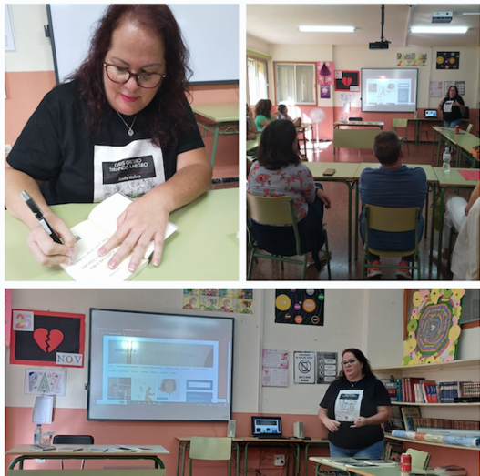 Y como colofón, la visita de la escritora y periodista galdense Josefa Molina Rodríguez, quien presentó su último libro, Gris oscuro tirando a negro (Primera edición: marzo 2023). A lo largo de la semana, el alumnado realizó en clases diferentes lecturas colectivas de obras de Molina.