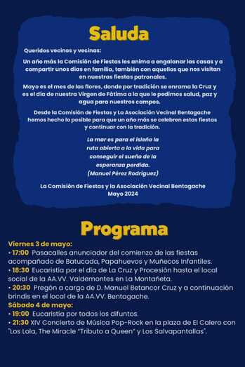Previamente, ese mismo viernes a las 17.00 horas habrá un pasacalle anunciador acompañado de una batucada, papahuevos y muñecos infantiles, y a las 18.30 horas se celebra una eucaristía por el Día de la Cruz y procesión hasta el local social de la Asociación de Vecinos Valdemontes en La Montañeta.