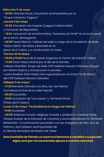 El lunes 13 de mayo, festividad de la Virgen de Fátima, habrá una eucaristía a las 9.00 horas y la solemne función religiosa presidida por el obispo auxiliar de la Diócesis de Canarias, Cristóbal Déniz, acompañada por la rondalla Beñesmén, a las 20.00 horas. A continuación se celebrará la procesión con la imagen de Nuestra Señora de Fátima y San Esteban, con la Banda de Música de Telde.