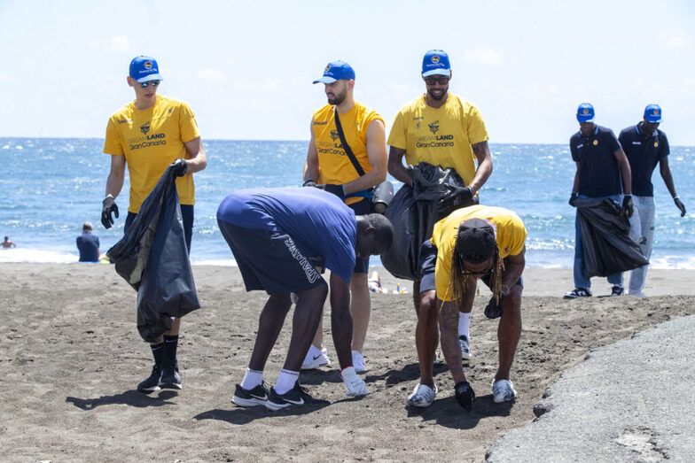 Los jugadores del Dreamland Gran Canaria, su cuerpo técnico, trabajadores del club y jugadores del LEB Plata acudieron este lunes a la playa teldense de La Garita para realizar una limpieza en una acción enmarcada en el proyecto ‘Compromiso Granca’.