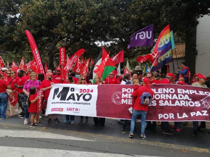 "Por el pleno empleo: menos jornada, mejores salarios" ha sido la consigna incluida en la pancarta que abría la marcha en la capital tinerfeña, en donde según fuentes de la Policía Nacional se han reunido unos 900 manifestantes que a los tradicionales estandartes sindicales han sumado enseñas con las siete estrellas verdes, la bandera palestina o la republicana.