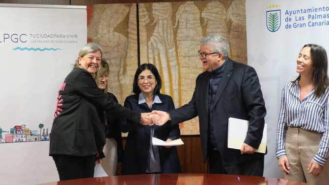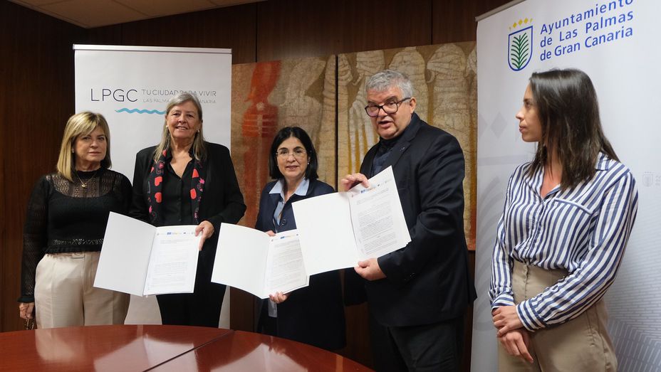 La alcaldesa, Carolina Darias, la concejala de Aguas, Inmaculada Medina; el director de la Plocan, José Joaquín Hernández Brito; y Mercedes Fernández-Couto, directora general de Emalsa, han estado presentes en la rúbrica, que permitirá al Consistorio ceder unos 800 metros cuadrados para la construcción del nuevo edificio, situado en las plantas de Emalsa de la Potabilizadora de Jinámar, con el propósito de producir hidrógeno verde de manera sostenible y promover su uso en diferentes materias.