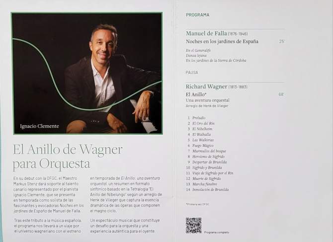 Como bien se expone en el díptico informativo del concierto que se distribuye a la entrada: Tras este tributo a la música española, el programa nos llevará a un viaje por el universo wagneriano con el estreno en temporada de El Anillo: una aventura orquestal, un resumen en formato sinfónico basado en la Tetralogía “El anillo del Nibelungo” según un arreglo de Henk de Vlieger que captura la esencia dramática de las óperas que componen el magno ciclo. Un espectáculo musical que constituye un desafío para la orquesta y una experiencia para el oyente.