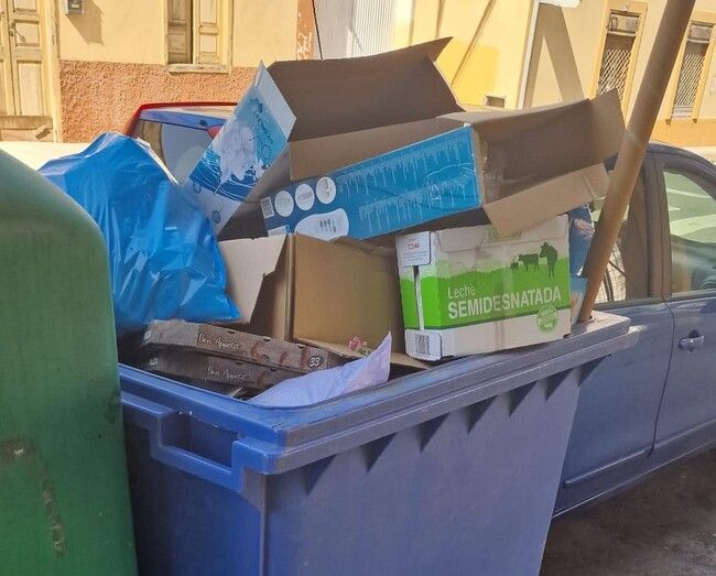 Vecinos de Valle de Los Nueve denuncian el mal uso de los contenedores ubicados junto al colegio Maestro Félix Santana, ya que en el azul, reservado solo para papel y cartón, arrojan todo tipo de residuos, mientras que el contenedor gris está vacío.