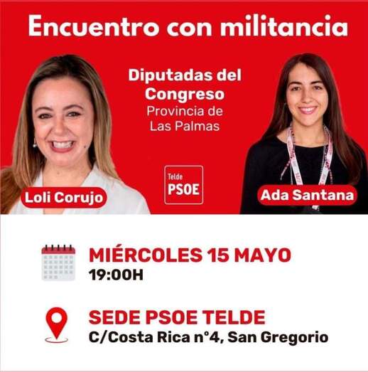El próximo miércoles, 15 de mayo, a las 19.00 horas, la sede local del PSOE Telde acoge un encuentro con las diputadas del Congreso por la provincia de Las Palmas, Loli Corujo y Ada Santana. Se trata de un acto abierto, en el que la militancia tendrá la oportunidad de conocer de primera mano la labor del grupo parlamentario socialista canario en el Congreso, las acciones del gobierno central y un análisis de la situación a nivel nacional.