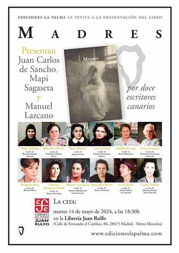 La actriz canaria Mapi Sagaseta, el director de la librería Juan Rulfo, Manuel Lazcano, y el escritor y antólogo de ‘Madres’, Juan Carlos De Sancho, serán los encargados dar a conocer este trabajo publicado por Ediciones La Palmas en el local ubicado en la calle Fernando el Católico, 86, en el barrio de Chamberí.