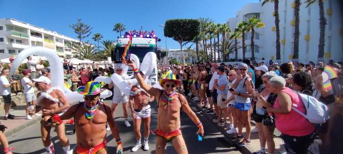 ‘El Pride que conmueve al mundo’, lucía una de las carrozas del desfile. Por las calles de Maspalomas desfilaron cuerpos musculados con bañadores diminutos, con vestimentas de cuero, bronceados y barbas estilizadas. La comunidad lesbiana se manifestaba con bikinis, tacones, camisas con manga corta, vestidos y tops decorados con los colores del arco iris.