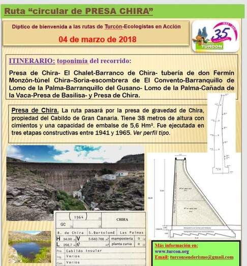 Al año siguiente, en el 2018, Turcón-EeA realizó una visita, a modo de ruta de divulgación y concienciación, por los lugares cercanos de la Presa de Chira, explicando los enormes valores naturales y culturales del lugar, así como, unas breves reseñas del macro-proyecto que alteraría el equilibrio de la zona.