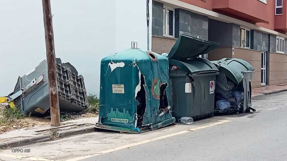 Vecinos de Marpequeña Alta se encontraron este domingo con cuatro contenedores de residuos destrozados y uno de ellos volcado en la calle Cánovas del Castillo.