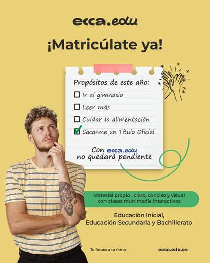 Ecca.edu ha abierto la matrícula para toda su oferta educativa, con titulaciones oficiales en modalidad a distancia y semipresencial. Entre las novedades destaca la puesta en marcha del EIPA (Educación Inicial para personas adultas) y ESPA (Educación Secundaria para personas adultas), adaptándose a la nueva ley educativa LOMLOE y que permitirá al alumnado obtener su título oficial de secundaria en dos años.