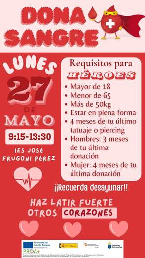 El Instituto José Frugoni Pérez (La Rocha) vuelve a participar en una campaña de donación de sangre en colaboración con el Instituto Canario de Hemodonación y Hemoterapia (ICHH), que tendrá lugar el 27 de mayo de 9.15 a 13.30 horas en este centro educativo.