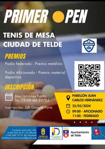 El club deportivo Axinamar, que preside Anatael Santana, organiza el primer open de tenis de mesa para el fomento y promoción de está disciplina deportiva. La competición tendrá lugar este sábado, desde las 9.00 horas, en el pabellón Juan Carlos Hernández de Jinámar.