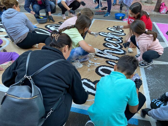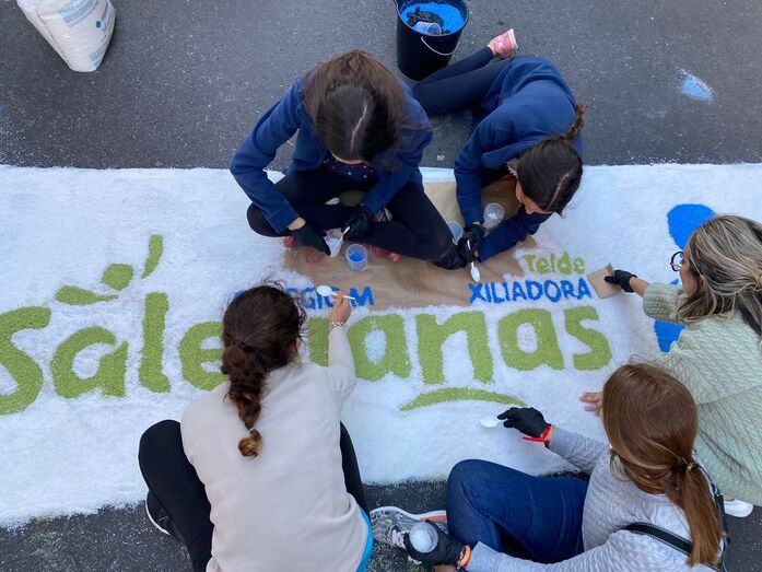 También este año, por primera vez, se ha confeccionado por los alumnos una alfombra de sal en la calle de El Salvador, calle por el que procesiona la imagen antes de entrar al colegio salesiano.