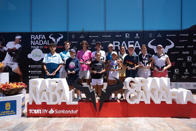 El Rafa Nadal Tour By Santander 2024 coronó a sus seis campeones en una inolvidable mañana de tenis de formación en las instalaciones del Tennis Academy El Cortijo. Seis ganadores, Austin Feltham, Toni Escarda, Julio Zárate, Liliana Chetry, Ana Cabassers y Caterina López que pusieron el broche de oro a un torneo solidario que arrancó el pasado domingo, 19 de mayo, con más de 300 deportistas y casi 300 partidos en total.