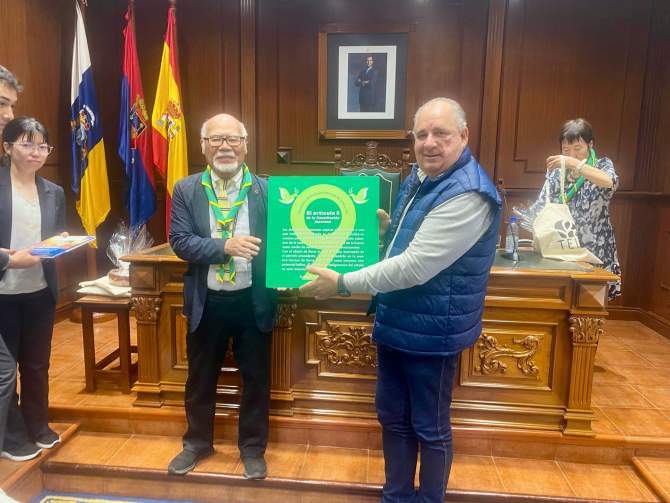 En un acto preparado en las Casas Consistoriales, Juan Martel expresó su gratitud por la valentía mostrada y por el camino que siguen en busca de la paz mundial. En esa misma ubicación, fueron invitados al encuentro más de una veintena de adolescentes de los Boy Scouts de Telde. Allí pudieron conocer a los protagonistas de una de las barbaries más grotescas de la historia contemporánea, quienes compartieron con ellos sus experiencias y un mensaje a favor de la paz, recordando los horrores de la guerra y abogando por un mundo libre de armas nucleares.