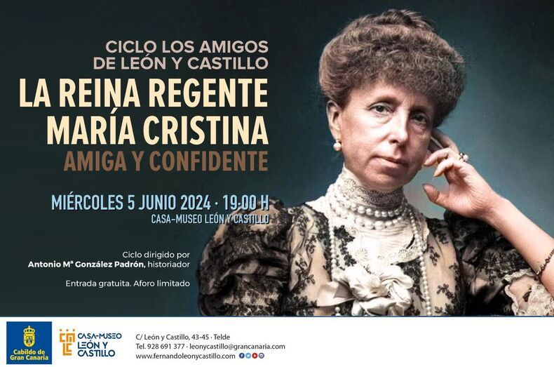 La amistad entre la regente de España, doña María Cristina de Habsburgo-Lorena, viuda del rey Alfonso XII y madre del futuro Alfonso XIII, y don Fernando León y Castillo, “como dirían nuestros paisanos teldenses, venía de lejos”, asevera el historiador y cronista de Telde, Antonio González Padrón. Y la lejanía de esta estrecha relación de amistad será analizada en la cita de junio del ciclo de conferencias ‘Los amigos de León y Castillo’, que el cronista dirige en la Casa-Museo de los célebres hermanos teldenses en el barrio de San Juan, en Telde. Padrón imparte esta charla el día 5 de junio, a las 19:00 horas, con entrada libre y gratuita, hasta completar aforo.