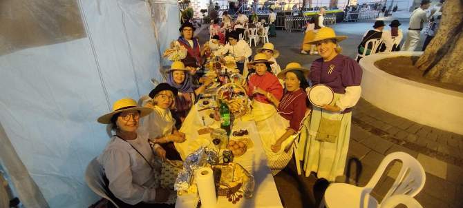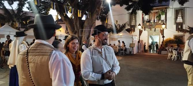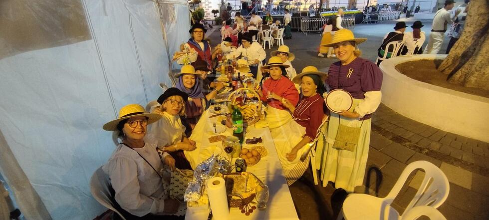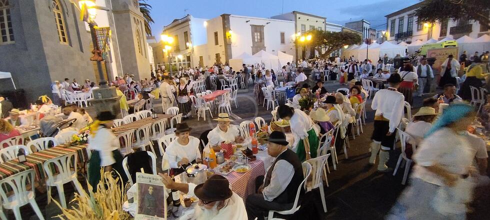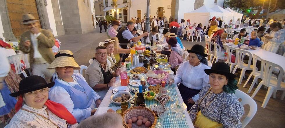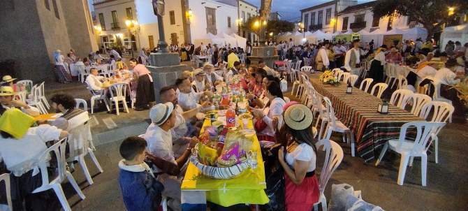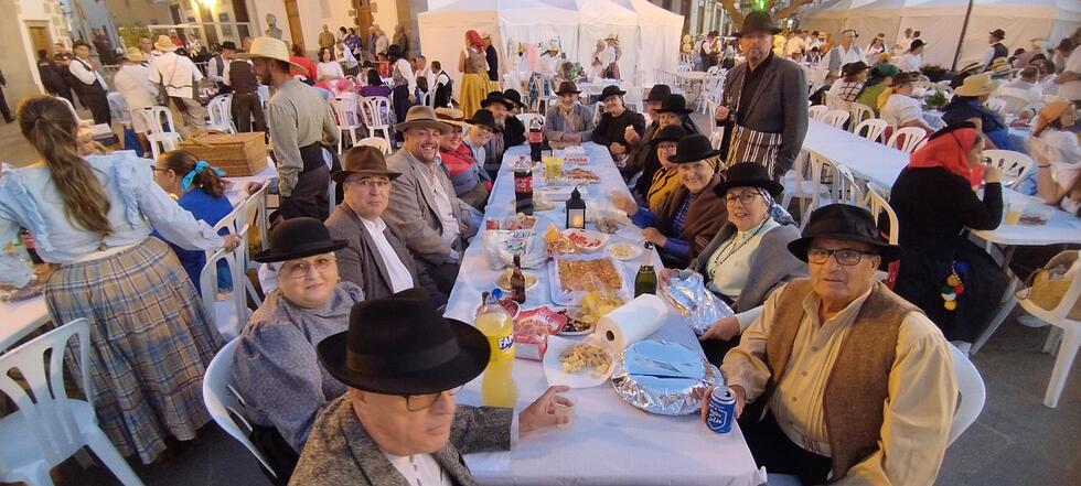 Desde las 21.00 horas, la plaza se transformó en un espacio de convivencia y alegría, con 60 mesas dispuestas, cada una decorada con esmero por los participantes en ropa típica canaria. Esta peculiar celebración permitió que los asistentes trajeran su propia comida y bebida, creando un ambiente festivo y auténtico.