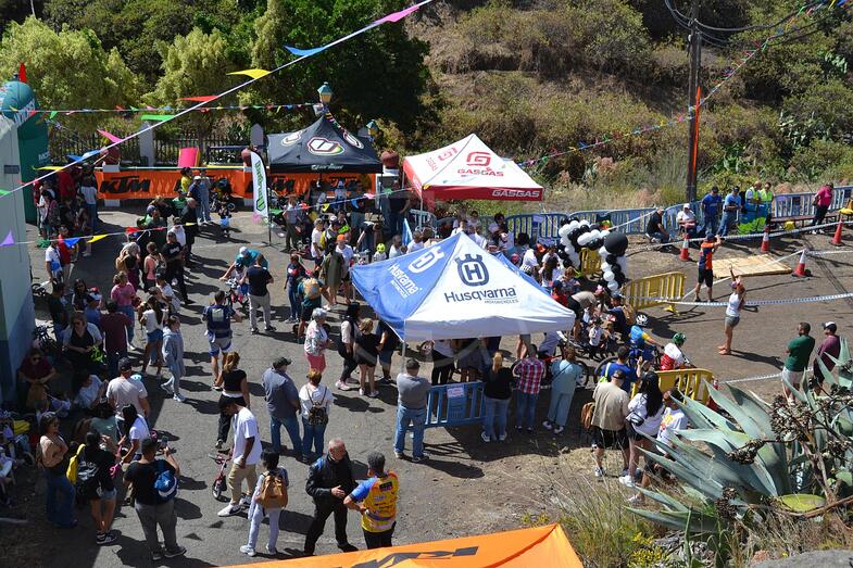 Y así arrancó en una veraniega mañana el surtido y el desfile de paseo a la montaña, había estrenos y novedades en la programación. El primero y más inminente el espectáculo de los benjamines en su primera experiencia en dos ruedas. Mangas organizadas por el equipo de Zule, que hacía honor a su trabajo ilusionada con los más peques. Mucho público, tanto que el aparcamiento era kilométrico y organizado por los amigos del Patronato de Fiestas de Maria Auxiliadora. En las caras equipadas de los mas pequeños la sensación de un día en las carreras. En sus primeras andanzas. El aplauso permanente, la compañía familiar y el ambiente rural del campo canario, crearon el clima perfecto para que la combinación germinara sus primeros brotes de felicidad y futuro. Sin duda brilló a gran nivel el montaje, el decorado, el colorido y el contenido. Regalos a doquier para los peques, medalla del honor, avituallamiento de energía y arropo de todos.