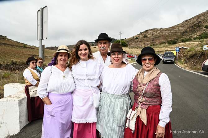 Como cada año, la romería comenzó con el recorrido desde la emblemática Cruz de los Morretes hasta la plaza del pueblo. Las carretas engalanadas con flores y banderas, tiradas por bueyes y adornadas con productos de la tierra, siguieron este camino mientras eran acompañadas por diversas parrandas y tocadores.