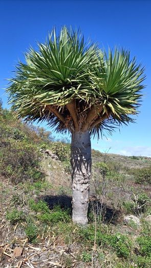 Sorprende, próximos a los muros que aterrazan el terreno, la presencia de media docena de dragos bien desarrollados, observándose los esqueletos de un par de ellos que, secos, conservan aún el porte de lo que fueron antaño. Se trata de dragos con varias décadas de vida, tal y como podemos calcular basándonos en el número de floraciones y posterior ramificación de los mismos. Es una sorpresa muy agradable encontrar estos dragos plantados engalanando tan paradisíaco paisaje.