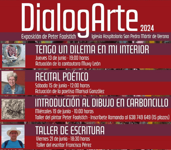 La iglesia de San Pedro Mártir celebrará, a partir de este jueves 13 de junio, una rica variedad de actividades multidisciplinares, paralelas a la exposición del pintor Peter Faalstich, DialogArte, que estará abierta al público hasta el próximo domingo 30 de junio -en horario de 10.30 a 13.00 y de 17.00 a 20.00 horas, de lunes a viernes, y los sábados de 10.30 a 13.30 horas-.