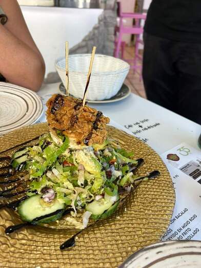 Queso asado con gofio y miel de palma, huevos fogonazo, champiñones rellenos de almogrote, piruletas de langostinos, diferentes tipos de ensaladas, toda clase de carnes, pescados y, como platos estrella, cachopo relleno, solomillo escondido y entrecot de ternera rosada, con sopa de chocolate blanco de postre, son solo algunos de los platos que se pueden degustar en este guachinche teldense.