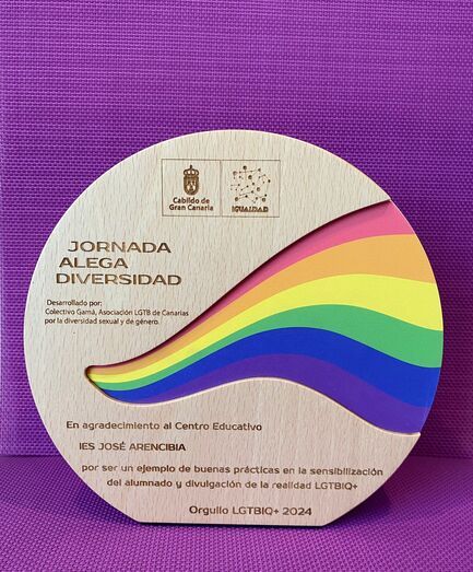 El IES José Arencibia Gil de Telde recibió este lunes, en el marco de la celebración de la I Jornada Alega, un reconocimiento por parte del Cabildo de Gran Canaria y del Colectivo Gamá por sus buenas prácticas en la sensibilización del alumnado y divulgación de la realidad LGTBIQ+.