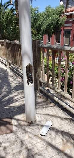 Vecinos de San Juan alertan del peligro que supone una farola del alumbrado público ubicada en la trasera de la calle Profesor Mejías Peñas, a la que se le caído la placa y presenta los cables al descubierto.