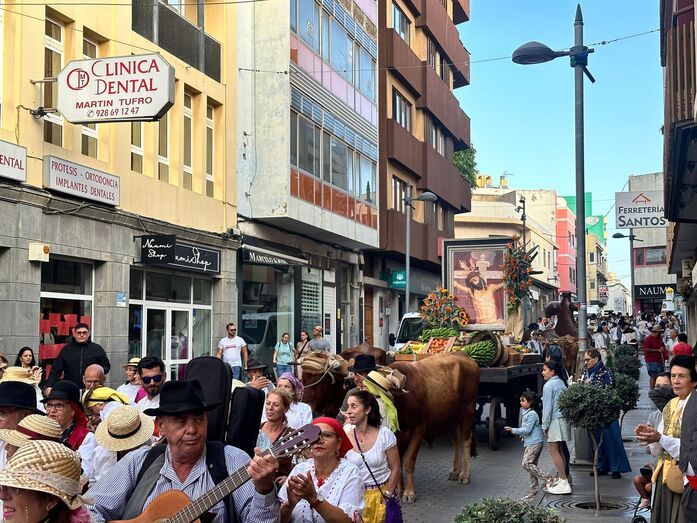 El popular desfile partió pasadas las 18.30 horas desde el parque Franchy Roca y enfiló la calle de María Encarnación Navarro, para luego transitar por las de Rivero Bethencourt, Avenida de la Constitución, Poeta Fernando González, Avenida del Cabildo, Rotonda Daora, Alcalde Manuel Álvarez Peña, Párroco Doctor Hernández Benítez, Pérez Camacho y tramo bajo de la calle León y Castillo. Desde allí la romería, animada por varios grupos folclóricos, discurriría hasta la plaza del conjunto histórico para entregar al santo las ofrendas, unos 1.000 kilos de alimentos que serán distribuidos por Cáritas Parroquial entre las familias más necesitadas.