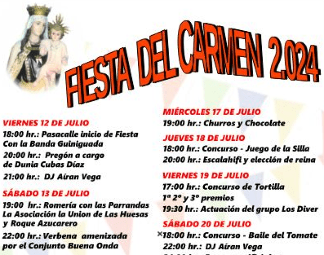 Organizados por la Asociación de Vecinos La Unión de Las Huesas, los festejos arrancarán el viernes 12 de julio con un pasacalles anunciador a cargo de la Banda Guiniguada (18.00 horas), el pregón a cargo de Dunia Cubas Díaz (20.00) y la actuación del DJ Airan Vega (21.00 horas).