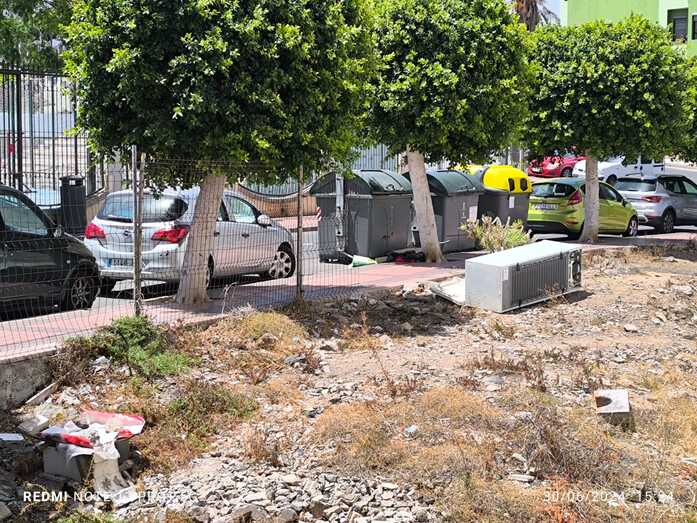Los residentes aseguran que han avisado a los servicios de Limpieza Viaria del Ayuntamiento hace más de dos semanas sobre un contenedor con la palanca rota, sin que se haya tomado ninguna medida al respecto. "Ese terreno se está convirtiendo en un estercolero", comentan con indignación.