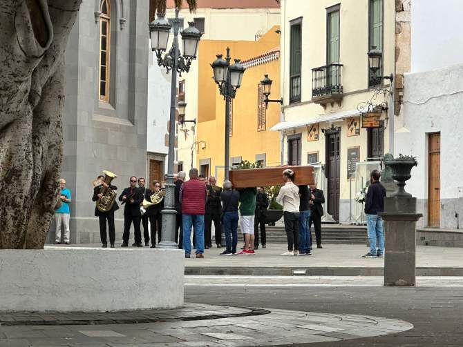 Durante la eucaristía, colocaron su trompeta sobre el féretro, como símbolo de su vinculación profesional a la Banda Municipal de Música de Telde. Y sonaron los sones el Toque de Oración y Silencio a dos trompetas.