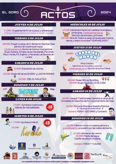 El miércoles 10 de julio, El Goro celebrará una merienda infantil con castillos hinchables y pintacaras (17.30 horas), la elección del príncipe y la princesa de las fiestas y una obra de teatro a cargo de la Escuela Municipal de Música, Danza y Teatro (20.30 horas).