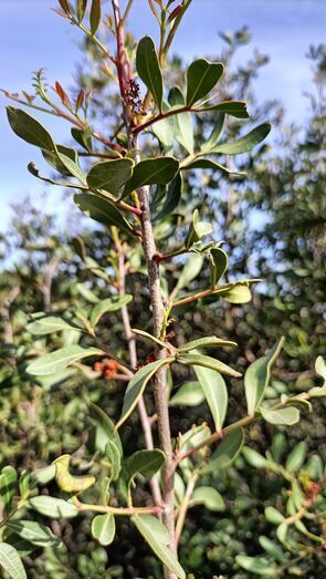 La ladera norte, que intento atravesar por su cara superior para evitar estas edificaciones, es un maleza de inciensos, vinagreras, tabaibas salvajes, cornicales y esparragueras, tan espesas que dificultan en extremo el tránsito entre ellas. Es el incienso quien domina el sustrato arbustivo con su masiva presencia y su penetrante aroma.