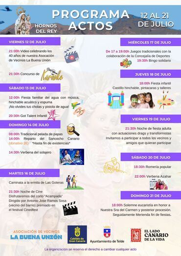 Hornos del Rey se pone en fiestas. El barrio celebra desde este viernes 12 de julio los fastos en honor a la Virgen del Carmen. Unos festejos en los que además, en esta edición, se conmemora el 40 aniversario de la Asociación de Vecinos La Buena Unión.